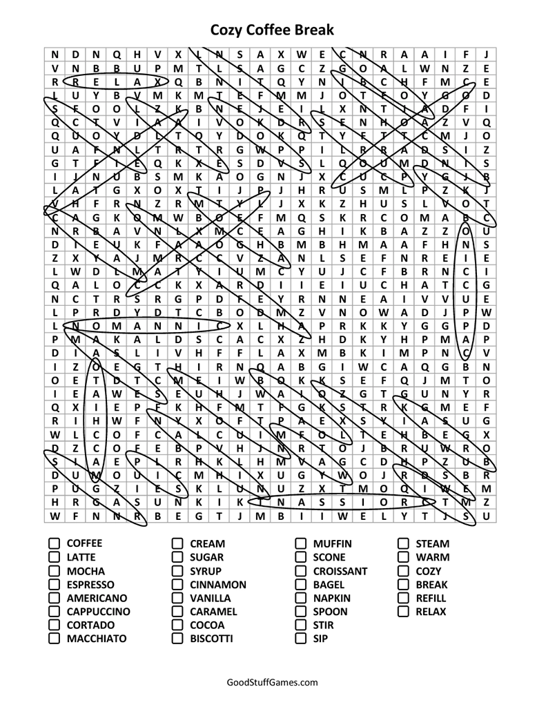 Enjoy some classic puzzle time with this Cozy Coffee Break Word Search Printable. Find words like Coffee, Latte, Mocha, Muffin and more. Words may run forward, backward, vertical or diagonal. Circle each one as you spot it.